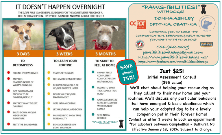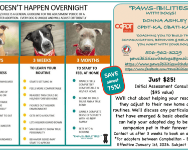 If you have recently adopted a dog from either the Restigouche County SPCA or the Bathurst SPCA and feel you need some advice, just reach out!